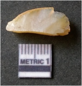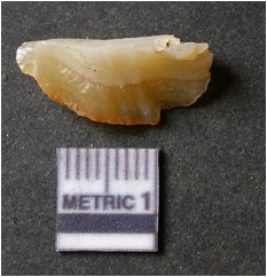 | Description / विवरण | It is chalcedony flake, translucent in appearance. The piece shows sharp pointed ends and flake scars on the surface as a result of flaking. The piece shows a bulb of percussion. |