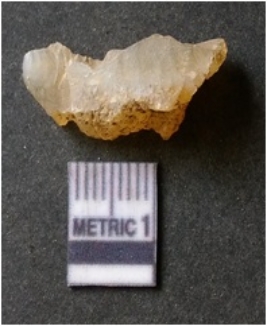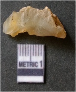 | Description / विवरण | It is chalcedony flake, translucent in appearance. The piece shows sharp pointed ends and flake scars on the surface as a result of flaking. The piece shows a bulb of percussion. |