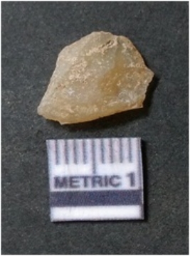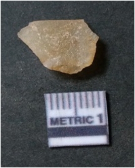 | Description / विवरण | It is chalcedony flake, translucent in appearance. The piece shows sharp pointed ends and flake scars on the surface as a result of flaking. The piece shows a bulb of percussion. |