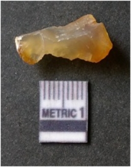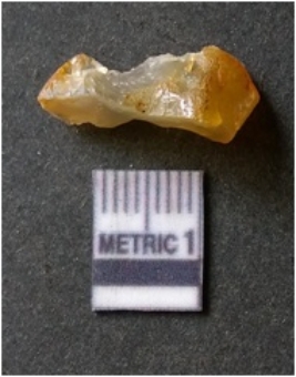 | Description / विवरण | It is chalcedony flake, translucent in appearance. The piece shows sharp pointed ends and flake scars on the surface as a result of flaking. The piece shows a bulb of percussion. |