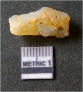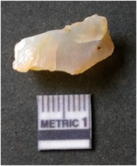 | Description / विवरण | The quartz flake has sharp flaked edges and pointed ends as a result of flaking. The piece is semi-transparent in nature with irregular fracture pattern. The piece is roughly triangular in shape and has a prominent bulb of percussion. |
