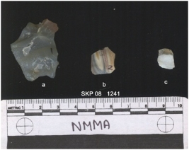 | Description / विवरण | Agate banded striking platform bulb on the ventral side. |