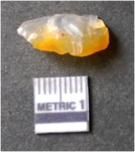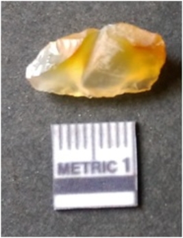 | Description / विवरण | It is chalcedony flake, translucent in appearance. The piece shows sharp pointed ends and flake scars on the surface as a result of flaking. The piece shows a bulb of percussion. |