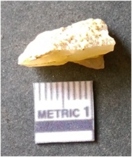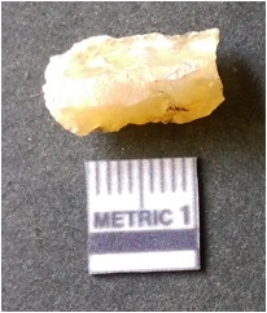 | Description / विवरण | The quartz flake has sharp flaked edges and pointed ends as a result of flaking. The piece is semi-transparent in nature with irregular fracture pattern. The piece is roughly triangular in shape and has a prominent bulb of percussion. |