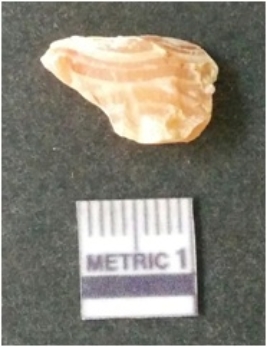 | Description / विवरण | The banded agate piece is crystalline in nature, with a smooth fracture pattern and visible bands on the flaked sides. The piece is pale in color and has sharp flaked ends. |