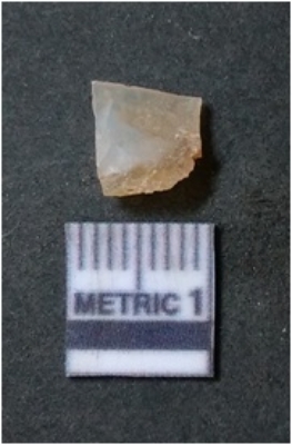 | Description / विवरण | The quartz flake has sharp flaked edges and pointed ends as a result of flaking. The piece is semi-transparent in nature with irregular fracture pattern. The piece is roughly triangular in shape and has a prominent bulb of percussion. |