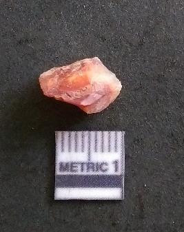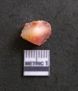 | Description / विवरण | It is a carnelian flake, with a striking platform with bulb of percussion on the ventral side. It is orangish in color, flake edges on the surface with ripple on it due to heavy percussion. |