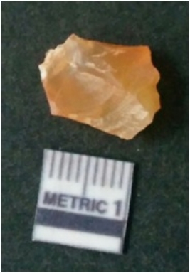 | Description / विवरण | The flake has irregular fracture pattern and sharp flaked edges as a result of lithic knapping activity. The piece is pale, with surfacial flake scars and a bulbous end. The quartz flake is rosy white in colour. |