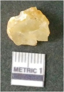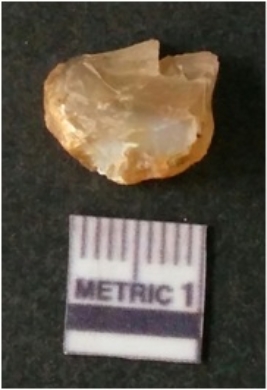 | Description / विवरण | It is chalcedony flake, translucent in appearance. The piece shows sharp pointed ends and flake scars on the surface as a result of flaking. The piece shows a bulb of percussion. |