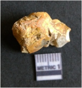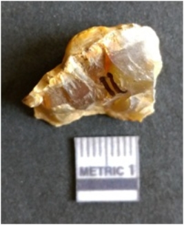 | Description / विवरण | The flake has irregular fracture pattern and sharp flaked edges as a result of lithic knapping activity. The piece is pale, with surface flake scars and a bulbous end. The flake is of smoky quartz variety, grayish in color and translucent in appearance. |
