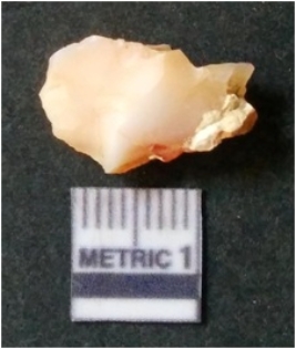| Description / विवरण | The milky quartz flake has irregular fracture pattern and sharp flaked edges as a result of lithic knapping activity. The piece is pale, with surfacial flake scars and a bulbous end. The flake is white in color. |