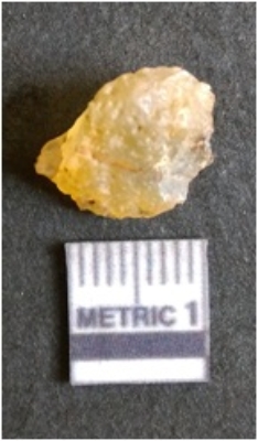 | Description / विवरण | The chalcedony flake is pale in color and translucent in appearance. The piece has s harp flaked ends and a bulbous end due to flaking. The flake has a crypto-crystalline silica matrix. |