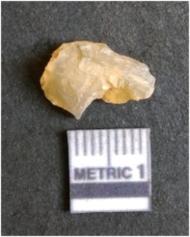 | Description / विवरण | The chalcedony flake is pale in color and translucent in appearance. The piece has s harp flaked ends and a bulbous end due to flaking. The flake has a crypto-crystalline silica matrix. |
