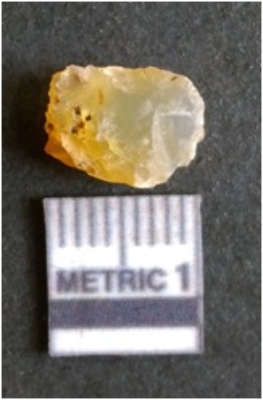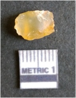 | Description / विवरण | The chalcedony flake is pale in color and translucent in appearance. The piece has s harp flaked ends and a bulbous end due to flaking. The flake has a crypto-crystalline silica matrix. |