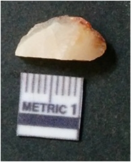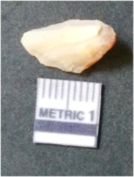 | Description / विवरण | The milky quartz flake has irregular fracture pattern and sharp flaked edges as a result of lithic knapping activity. The piece is pale, with surfacial flake scars and a bulbous end. The flake is white in color. |