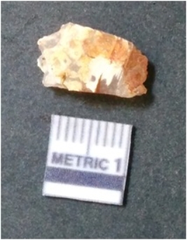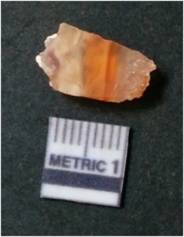 | Description / विवरण | The banded agate piece is crystalline in nature, with a smooth fracture pattern and visible bands on the flaked sides. The piece is pale in color and has sharp flaked ends. |