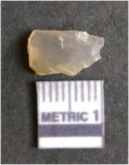 | Description / विवरण | The chalcedony flake is pale in color and translucent in appearance. The piece has s harp flaked ends and a bulbous end due to flaking. The flake has a crypto-crystalline silica matrix. |