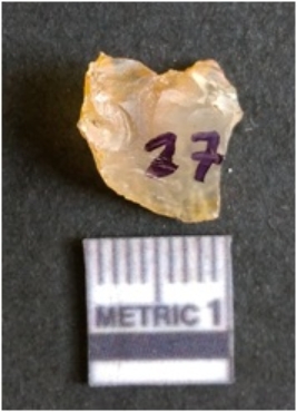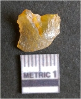 | Description / विवरण | The chalcedony flake is pale in color and translucent in appearance. The piece has s harp flaked ends and a bulbous end due to flaking. The flake has a crypto-crystalline silica matrix. |
