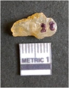 | Description / विवरण | The chalcedony flake is pale in color and translucent in appearance. The piece has s harp flaked ends and a bulbous end due to flaking. The flake has a crypto-crystalline silica matrix. |