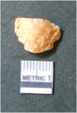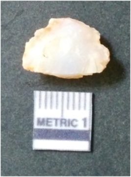 | Description / विवरण | The quartz flake has sharp flaked edges and pointed ends as a result of flaking. The piece is semi-transparent in nature with irregular fracture pattern. The piece is roughly triangular in shape and has a prominent bulb of percussion. |