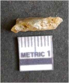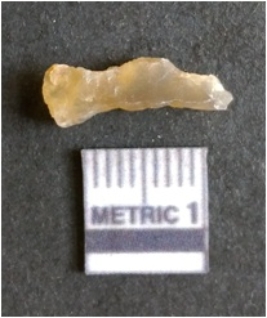 | Description / विवरण | The chalcedony flake is pale in color and translucent in appearance. The piece has s harp flaked ends and a bulbous end due to flaking. The flake has a crypto-crystalline silica matrix. |