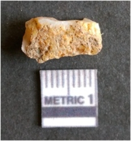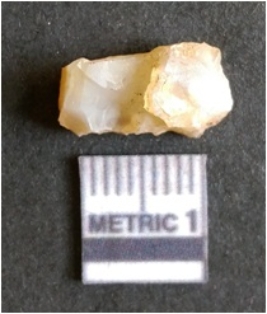 | Description / विवरण | The chalcedony flake is pale in color and translucent in appearance. The piece has s harp flaked ends and a bulbous end due to flaking. The flake has a crypto-crystalline silica matrix. |