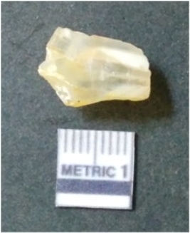 | Description / विवरण | The banded agate piece is crystalline in nature, with a smooth fracture pattern and visible bands on the flaked sides. The piece is pale in color and has sharp flaked ends. |