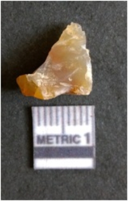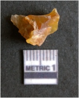 | Description / विवरण | The chalcedony flake is pale in color and translucent in appearance. The piece has s harp flaked ends and a bulbous end due to flaking. The flake has a crypto-crystalline silica matrix. |