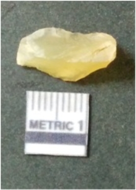 | Description / विवरण | It is chalcedony flake, translucent in appearance. The piece shows sharp pointed ends and flake scars on the surface as a result of flaking. The piece shows a bulb of percussion. |