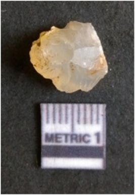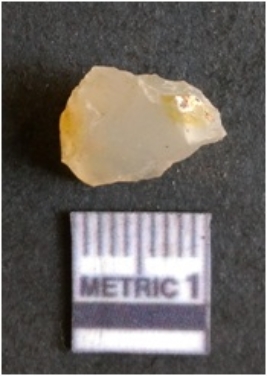 | Description / विवरण | The chalcedony flake is pale in color and translucent in appearance. The piece has s harp flaked ends and a bulbous end due to flaking. The flake has a crypto-crystalline silica matrix. |
