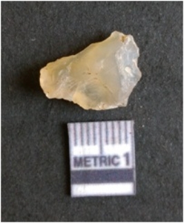 | Description / विवरण | The chalcedony flake is pale in color and translucent in appearance. The piece has s harp flaked ends and a bulbous end due to flaking. The flake has a crypto-crystalline silica matrix. |