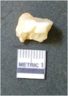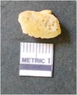 | Description / विवरण | The quartz flake has sharp flaked edges and pointed ends as a result of flaking. The piece is semi-transparent in nature with irregular fracture pattern. The piece is roughly triangular in shape and has a prominent bulb of percussion. |
