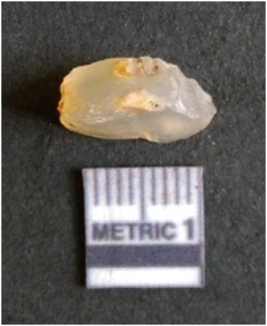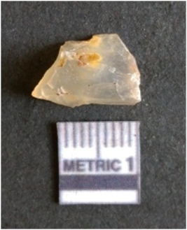 | Description / विवरण | The chalcedony flake is pale in color and translucent in appearance. The piece has s harp flaked ends and a bulbous end due to flaking. The flake has a crypto-crystalline silica matrix. |