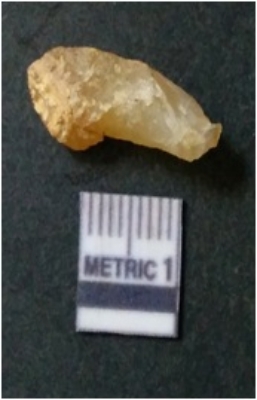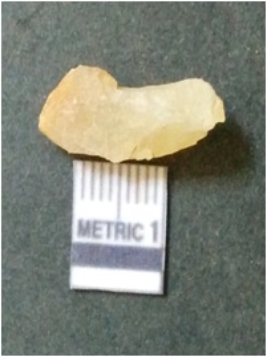 | Description / विवरण | The quartz flake has sharp flaked edges and pointed ends as a result of flaking. The piece is semi-transparent in nature with irregular fracture pattern. The piece is roughly triangular in shape and has a prominent bulb of percussion. |