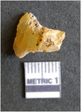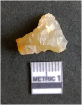 | Description / विवरण | The chalcedony flake is pale in color and translucent in appearance. The piece has s harp flaked ends and a bulbous end due to flaking. The flake has a crypto-crystalline silica matrix. |