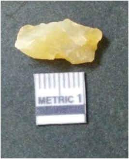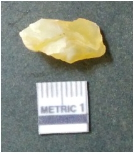 | Description / विवरण | It is chalcedony flake, translucent in appearance. The piece shows sharp pointed ends and flake scars on the surface as a result of flaking. The piece shows a bulb of percussion. |