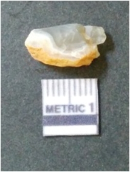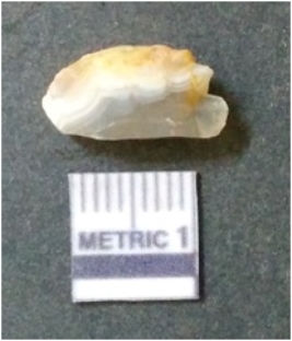 | Description / विवरण | It is chalcedony flake, translucent in appearance. The piece shows sharp pointed ends and flake scars on the surface as a result of flaking. The piece shows a bulb of percussion. |