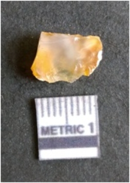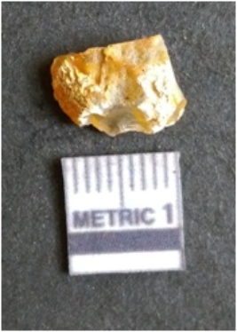 | Description / विवरण | The chalcedony flake is pale in color and translucent in appearance. The piece has s harp flaked ends and a bulbous end due to flaking. The flake has a crypto-crystalline silica matrix. |