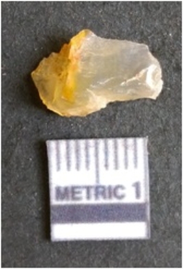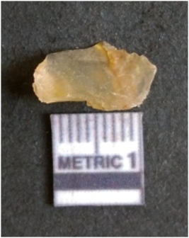 | Description / विवरण | The chalcedony flake is pale in color and translucent in appearance. The piece has s harp flaked ends and a bulbous end due to flaking. The flake has a crypto-crystalline silica matrix. |