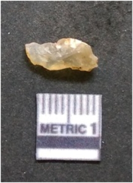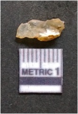 | Description / विवरण | The chalcedony flake is pale in color and translucent in appearance. The piece has s harp flaked ends and a bulbous end due to flaking. The flake has a crypto-crystalline silica matrix. |