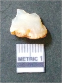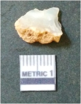| Description / विवरण | The quartz flake has sharp flaked edges and pointed ends as a result of flaking. The piece is semi-transparent in nature with irregular fracture pattern. The piece is roughly triangular in shape and has a prominent bulb of percussion. |