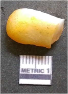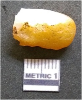| Description / विवरण | The chalcedony flake is pale in color and translucent in appearance. The piece has s harp flaked ends and a bulbous end due to flaking. The flake has a crypto-crystalline silica matrix. |