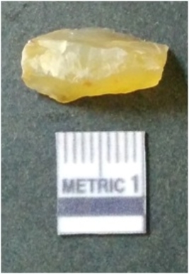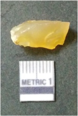 | Description / विवरण | It is chalcedony flake, translucent in appearance. The piece shows sharp pointed ends and flake scars on the surface as a result of flaking. The piece shows a bulb of percussion. |