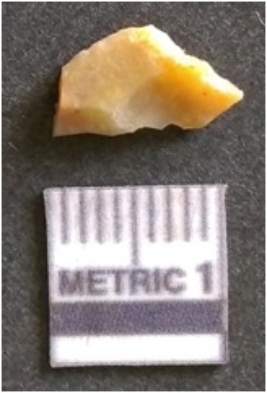 | Description / विवरण | The chert flake has a clear striking platform and ripple marks on the surface as a result of flaking. The piece is smooth, with regular fracture pattern and matt finish on the surface with a prominent bulb of percussion and sharp flaked edges. |