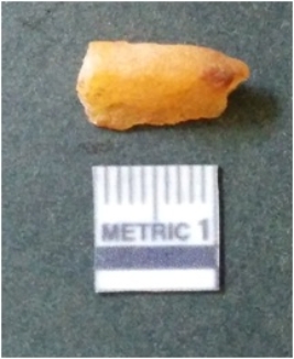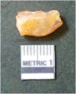 | Description / विवरण | It is chalcedony flake, translucent in appearance. The piece shows sharp pointed ends and flake scars on the surface as a result of flaking. The piece shows a bulb of percussion. |