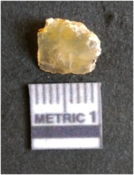 | Description / विवरण | The chalcedony flake is pale in color and translucent in appearance. The piece has s harp flaked ends and a bulbous end due to flaking. The flake has a crypto-crystalline silica matrix. |