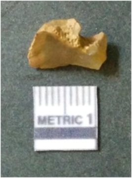 | Description / विवरण | The chert piece is dark in color, with a prominent bulb of percussion and sharp flaked edges. The piece is a part of lithic debitage or raw material for lithic knapping. The piece shows clear ripple marks and bulb of percussion. |