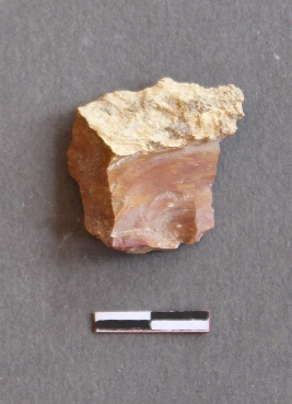 | Description / विवरण | Chert stone with cortex and bulb of percussion seen on one side, calcinated surface covered with calcium. |