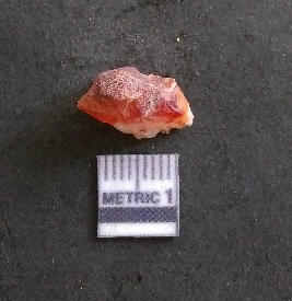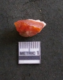 | Description / विवरण | It is a carnelian flake, with a striking platform with bulb of percussion on the ventral side. It is orangish in color, flake edges on the surface with ripple on it due to heavy percussion. |
