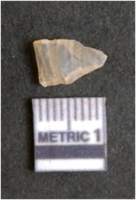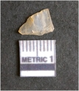 | Description / विवरण | The chalcedony flake is pale in color and translucent in appearance. The piece has s harp flaked ends and a bulbous end due to flaking. The flake has a crypto-crystalline silica matrix. |